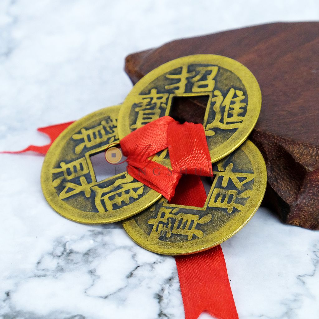 This Three Chinese Feng Shui Coins tied together with red ribbon is an auspicious symbol of wealth and fruitfulness as the three represent heaven, earth and mankind. In feng shui practice, placing 3 coins tie with red ribbon in your wallet will effectively boost your money and wealth luck.
